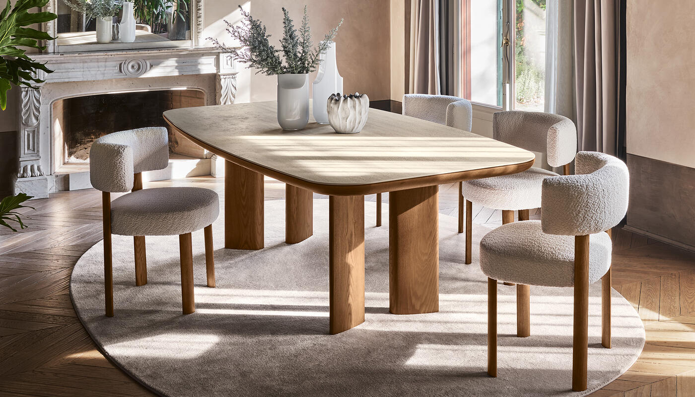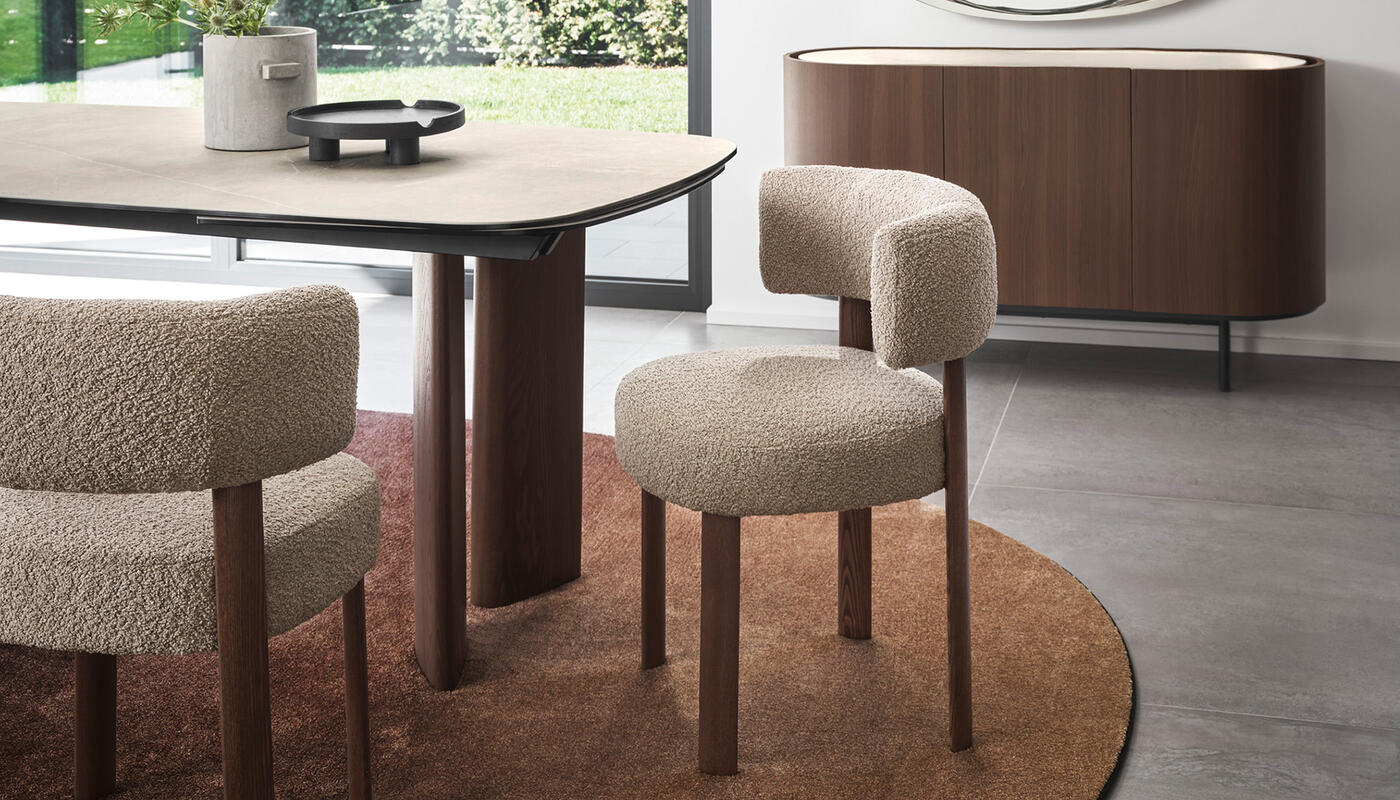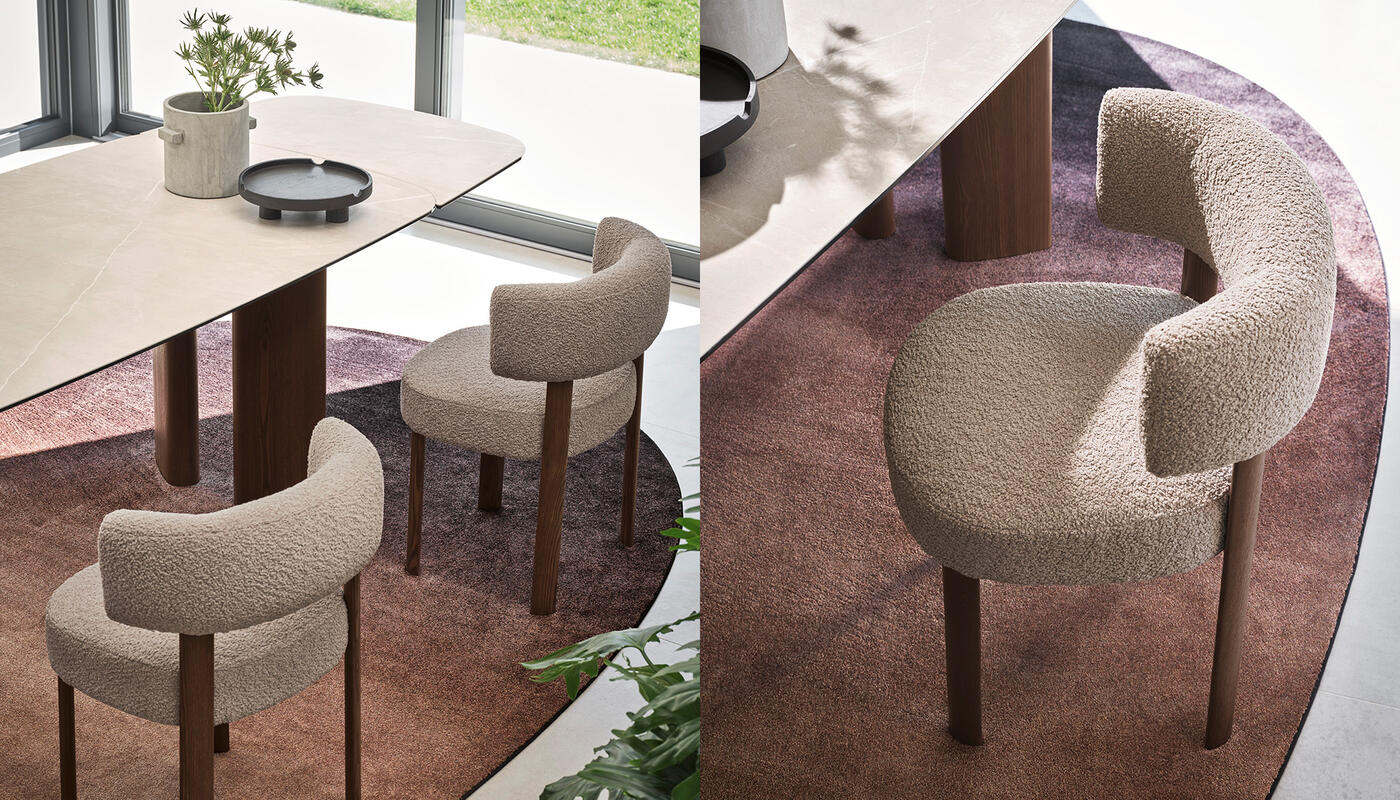 The Glen chair features a minimalist design. Lines and volumes provide it with a bold character and create a visual balance between solidity and lightness. The pure, geometric shape gives rise to a curved seat and backrest, the distinguishing feature of the design. Its wrap-around shape adds a harmonious look to the chair and provides ergonomic support, adapting to the natural posture of the body.