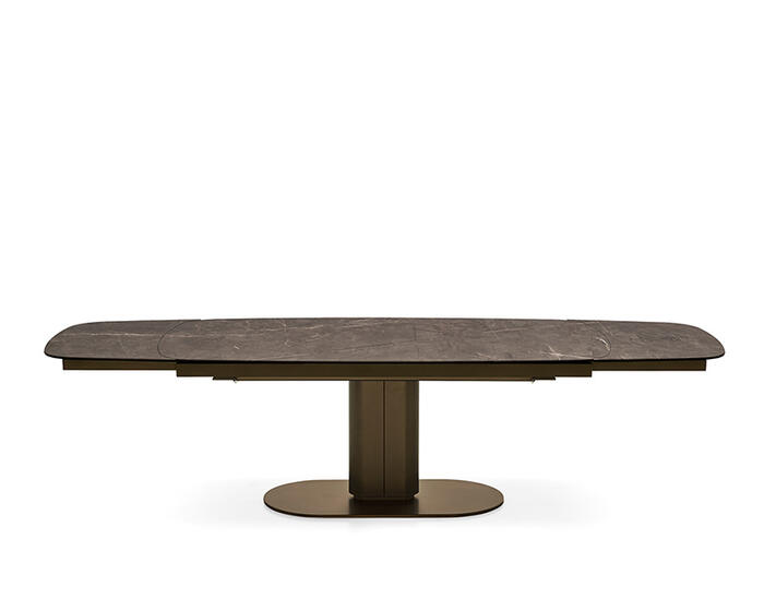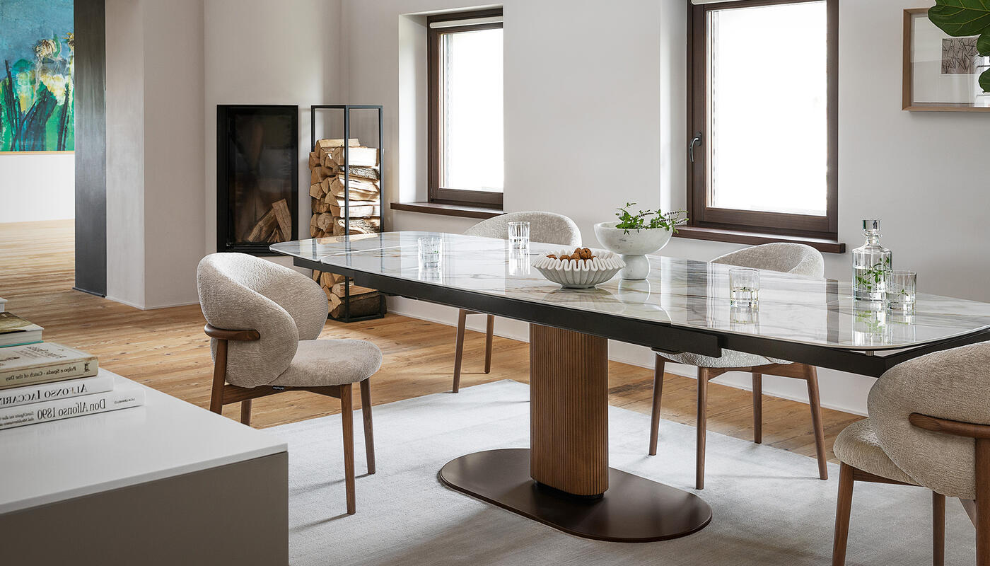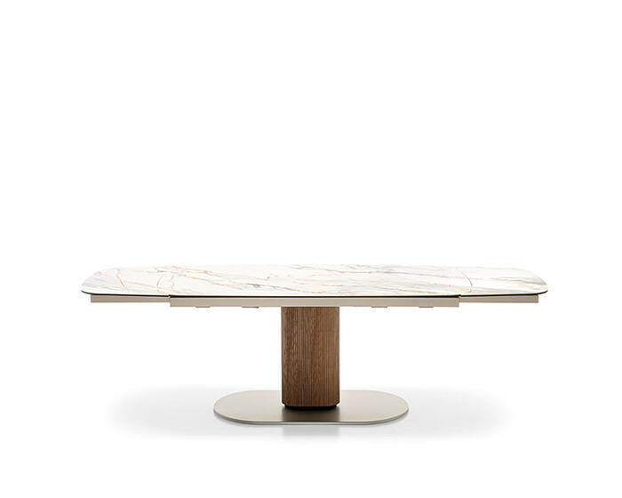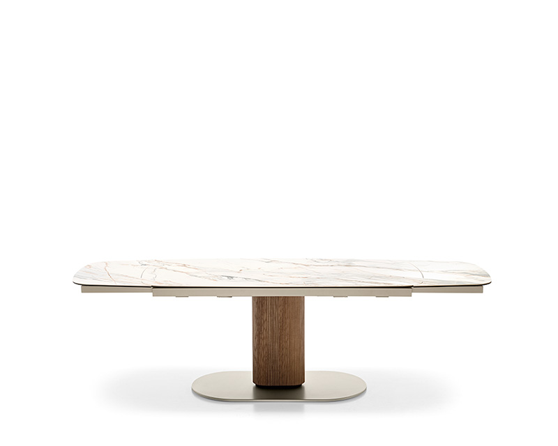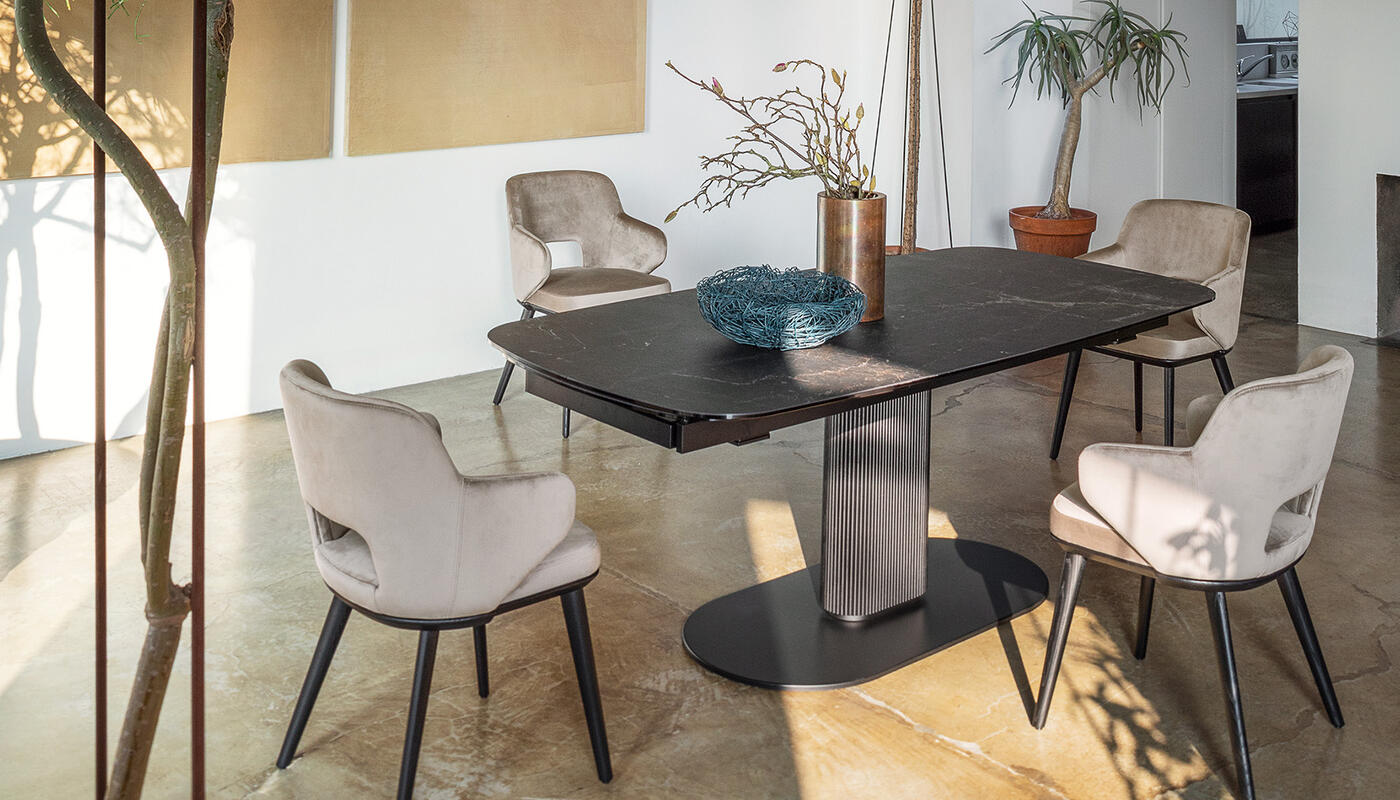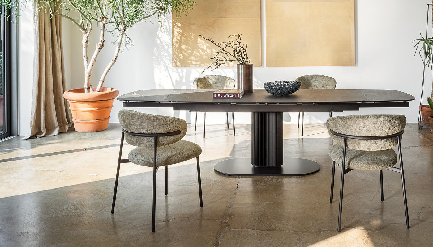 The CAMEO extendable table combines bold design with practicality, featuring a striking oval pedestal that offers stability and maximizes space beneath the tabletop. Its metal or wooden covered column pairs with various tabletop options, blending contrasting materials for a modern, playful design that exudes effortless sophistication.