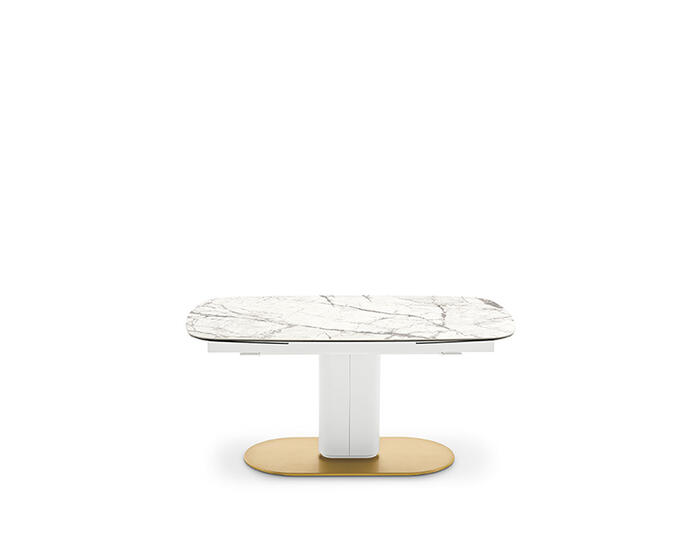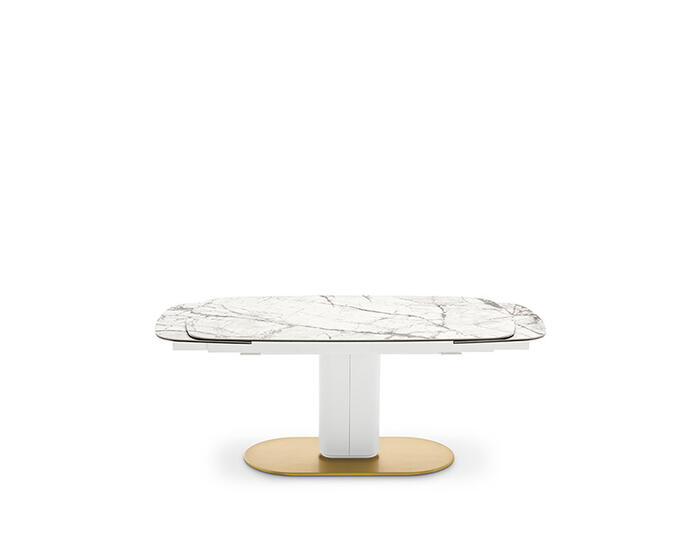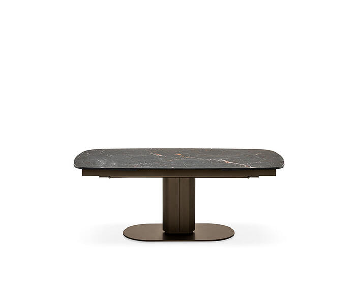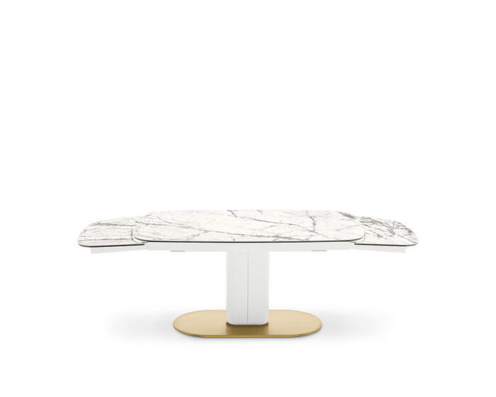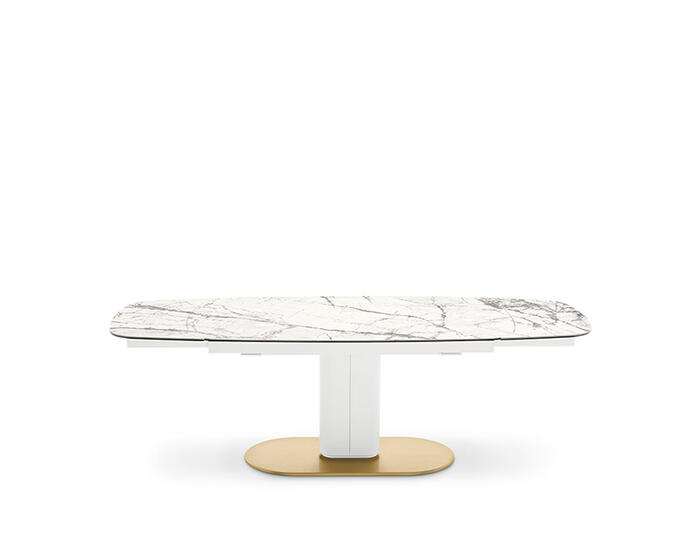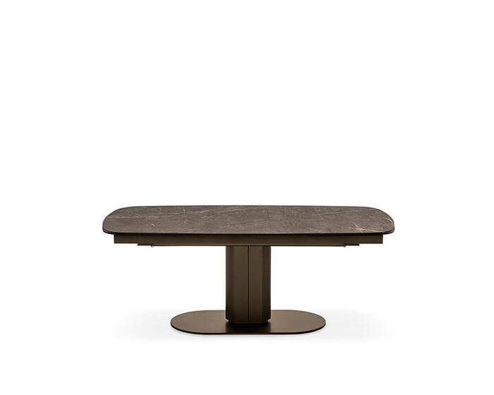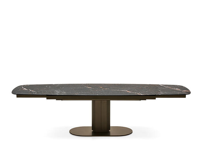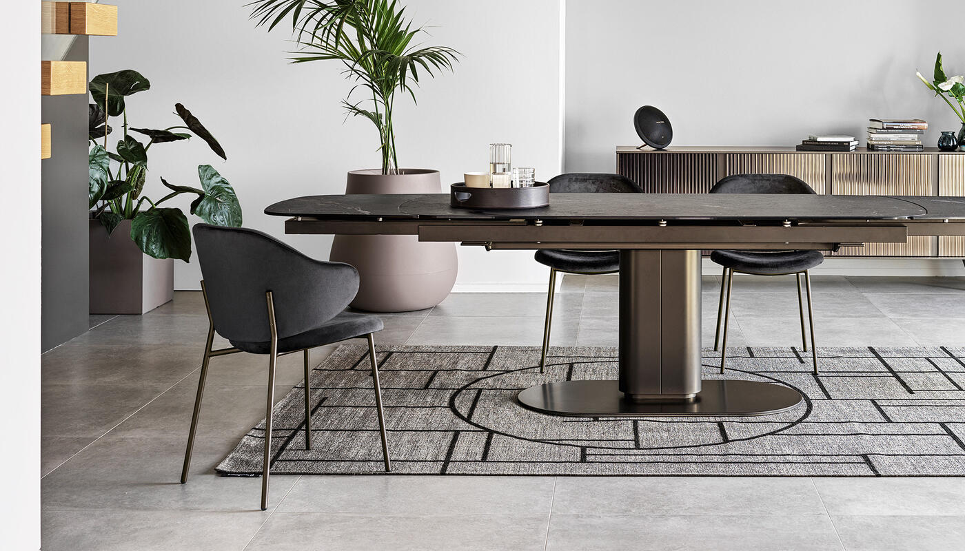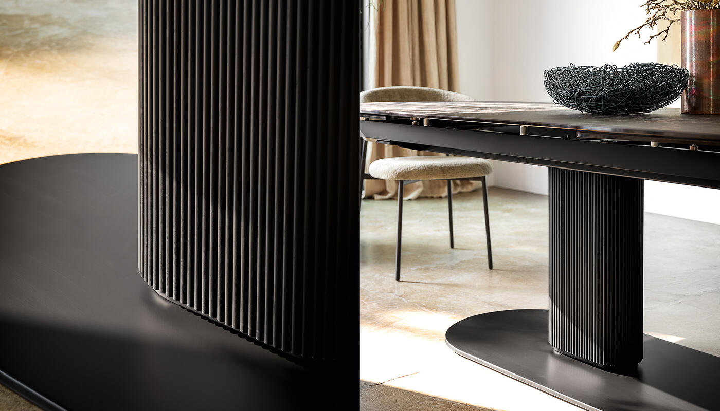 The CAMEO extendable table combines bold design with practicality, featuring a striking oval pedestal that offers stability and maximizes space beneath the tabletop. Its metal or wooden covered column pairs with various tabletop options, blending contrasting materials for a modern, playful design that exudes effortless sophistication.