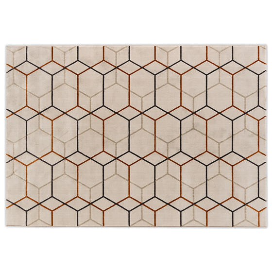78.75"W x 118"D (6.6' x 9.8') Woven pile rug - 60% Polypropylene & 40% Polyester; Color is Beige with Brick Red, Grey, and Brown accent -- On Display in Tysons