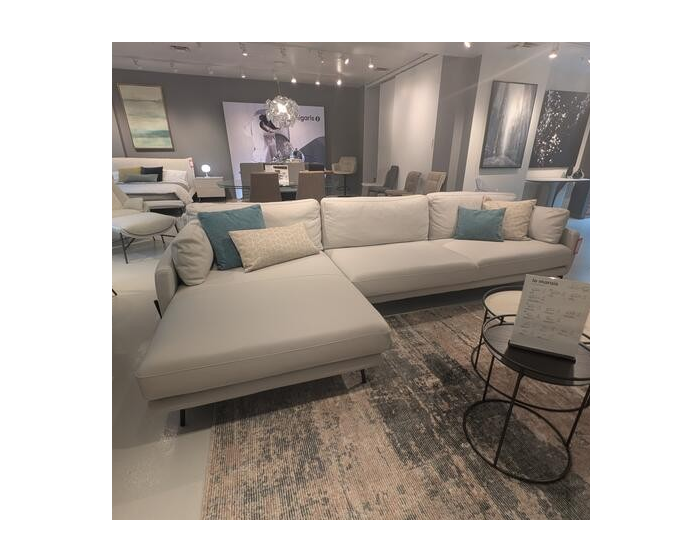 132 3/8"W x 65 3/4"D x 33 7/8"H; Matt Black legs with Bedford Taupe upholstery (x4 Available): Two available with the chaise on the right side, Two with the chaise on the left side; Matt Black legs with Foggy White seat (x4 Available): One available with chaise on the right, and 3 available with chaise on the left. Foggy Fabric Sofas were original price $6,312 are now $3,782 --the higher prices below are for the Bedford Fabric Sofas -- Stocked in HP Warehouse