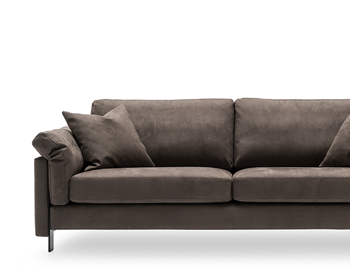 Meridien is a sofa shaped by clarity and restraint. Straight, elegant lines define its compact frame, lightly raised on slender painted metal feet that lend the design a sense of ease and proportion. The structure remains precise, allowing the softness of the cushions to take the lead.