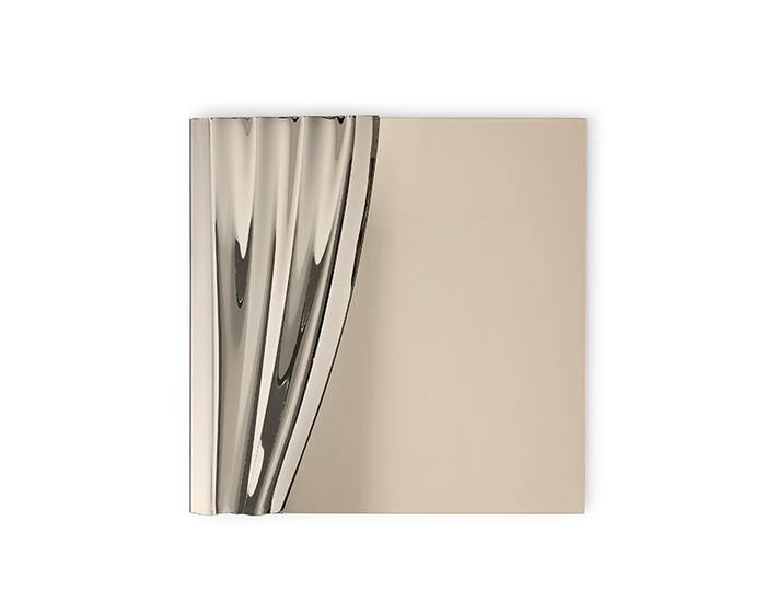 Inspired by the curtain of a theatre, the Sipario square mirror combines curved and flat glass elements in a poetic composition. The surface is divided into two distinct sections: one offering a clear reflection, the other gently distorting the image.