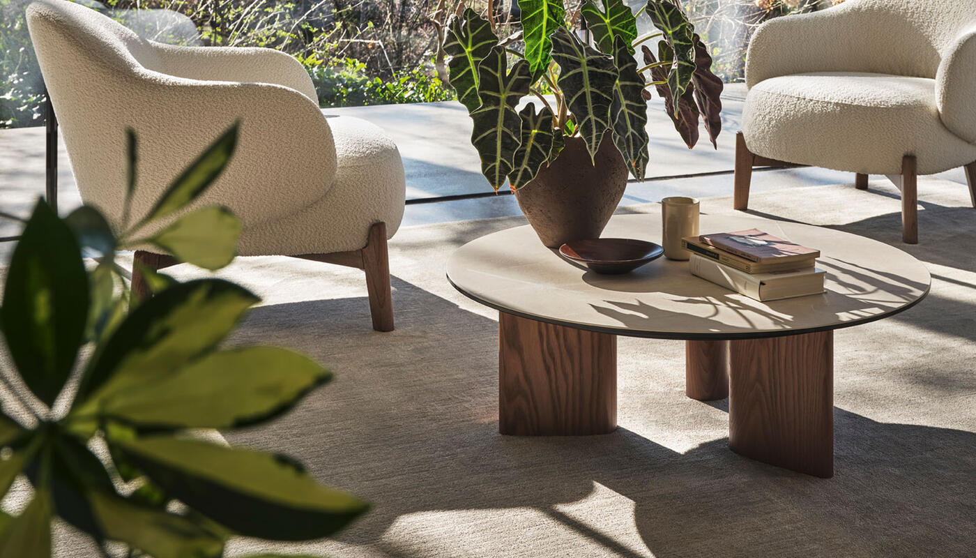 In this large round version, the design emphasizes balance and continuity, translating the collection’s defining element into a generously proportioned surface. Like the other Sandy tables—from classic coffee tables to console tables with two legs and smaller side tables with a central pillar—it offers a cohesive presence within the living space.