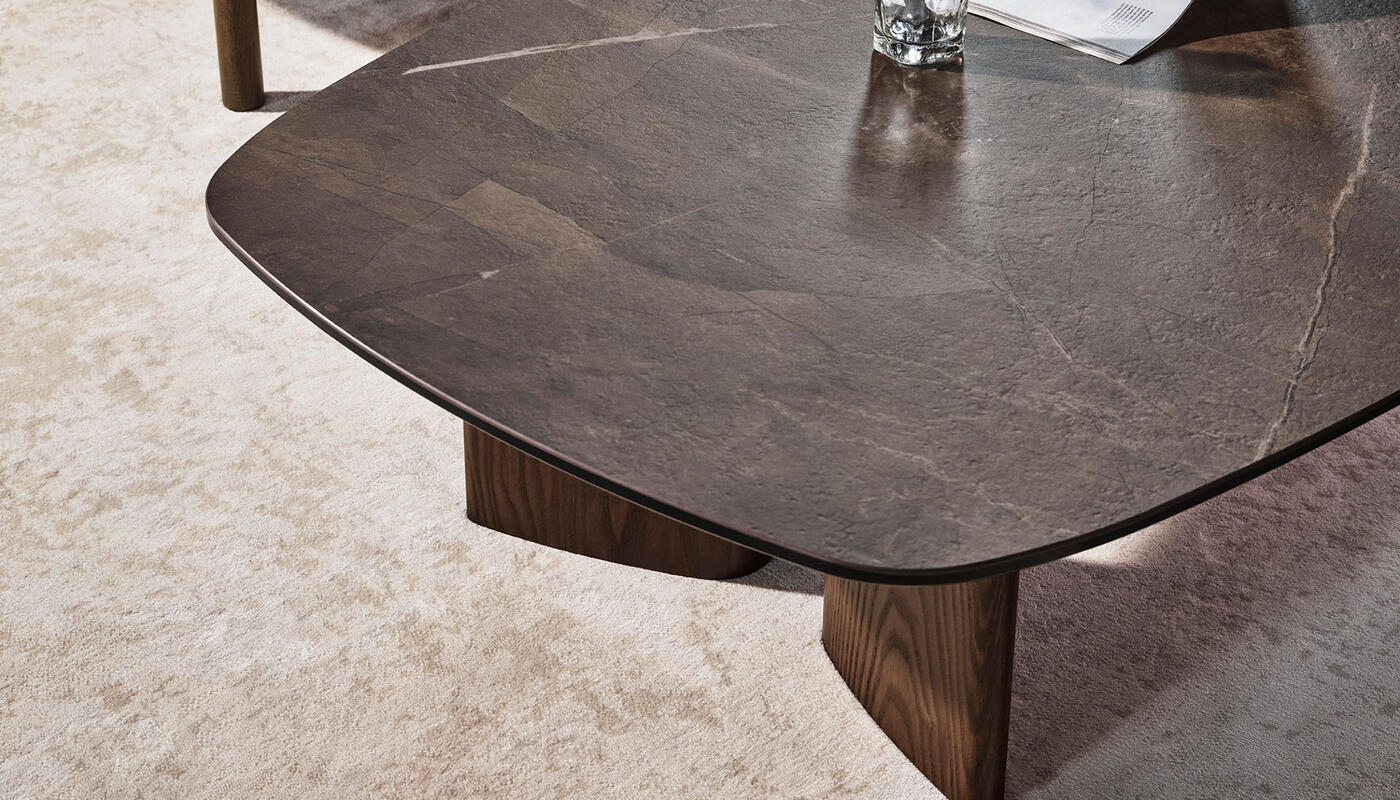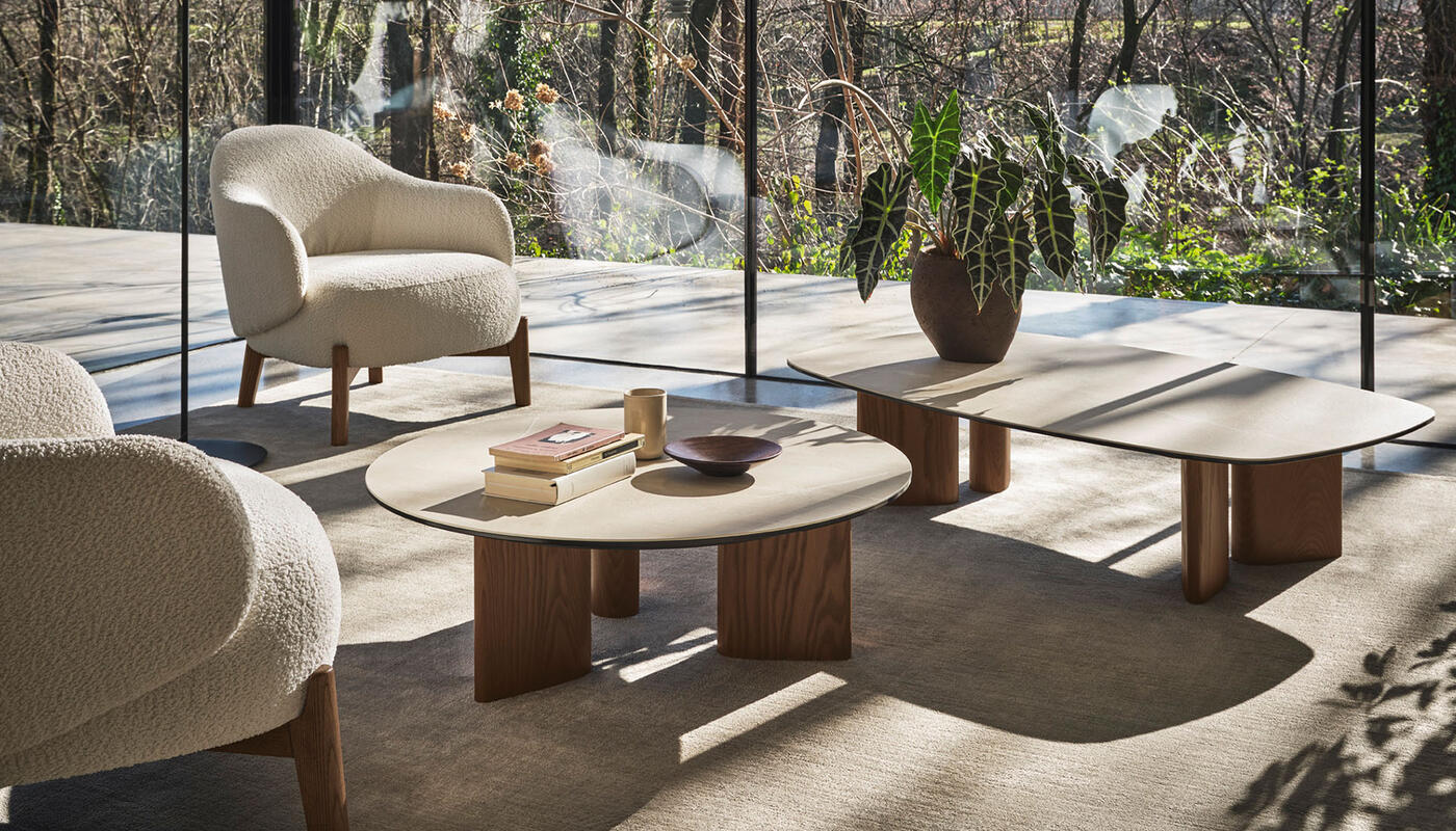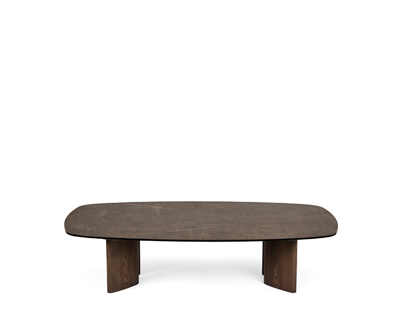 In this larger coffee table version, the elliptical top is supported with balance and visual continuity, expressing the same design language found across the Sandy family—from classic coffee tables to console tables with two legs and smaller side tables with a central pillar. The result is a coherent form that feels both expressive and grounded within the living space.