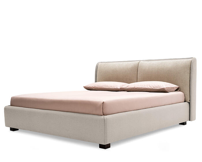 Dolly reinterprets the headboard as an embracing architectural element. Its distinctive shell rises from the base and wraps around two soft cushions, which can be upholstered in matching or contrasting materials to create subtle two-tone or two-material compositions. The result is a bed that feels both protective and expressive, balancing softness with structure.