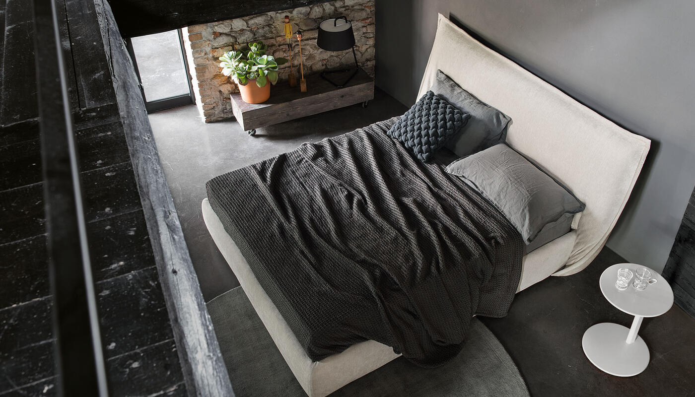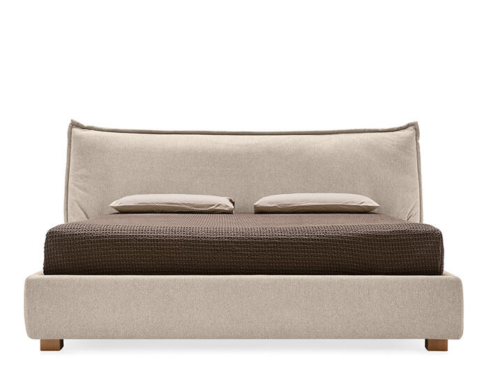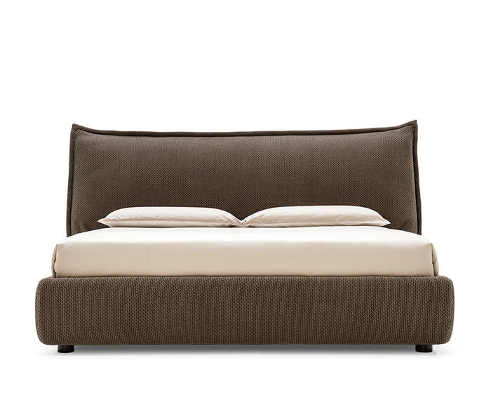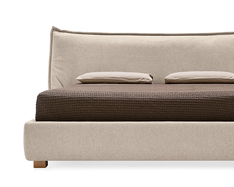 The effect recalls an oversized cushion, reinforced by the fully padded bed frame, resulting in a visually soft and welcoming composition. Available with a fixed base or with an integrated storage compartment, Softly balances tactile comfort with everyday practicality, while maintaining a relaxed, informal presence in the bedroom.