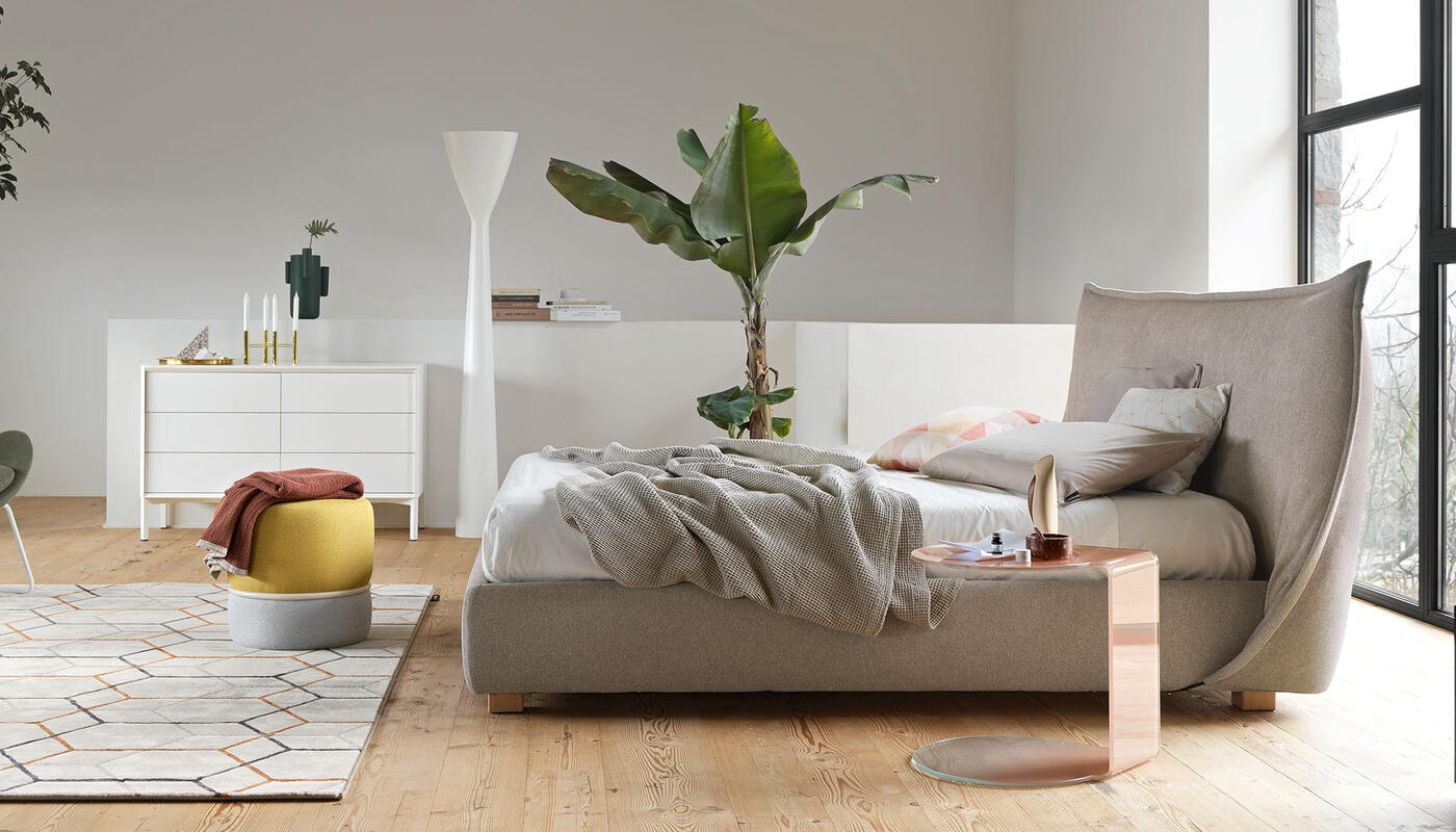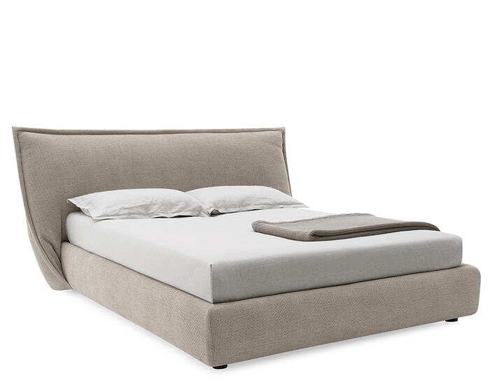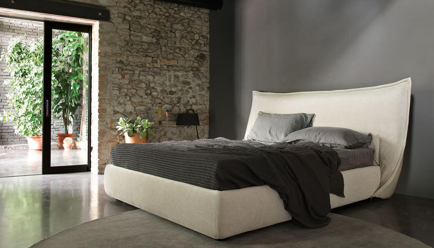 Softly is defined by an unconventional headboard designed to behave like a soft textile element rather than a rigid structure. Instead of remaining upright, the padded headboard folds in on itself, forming two generous, enveloping wings that frame the bed and create a sense of protection.