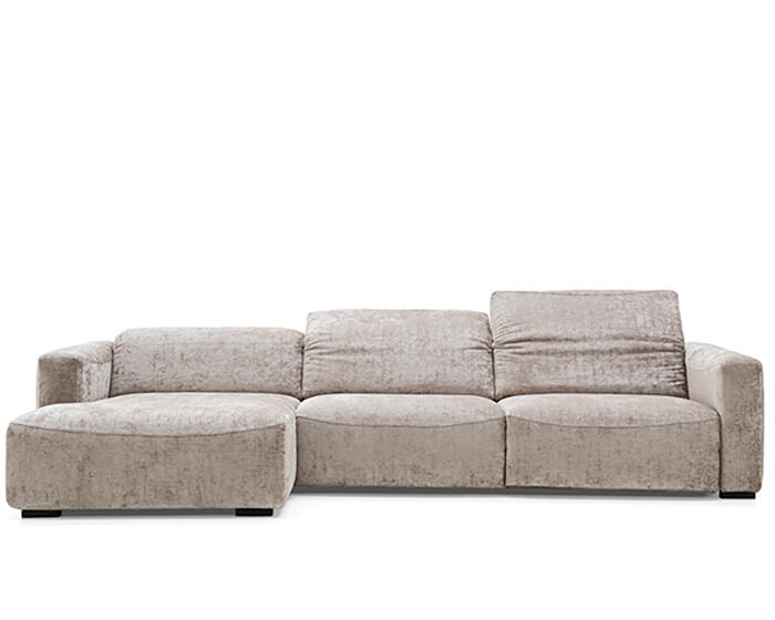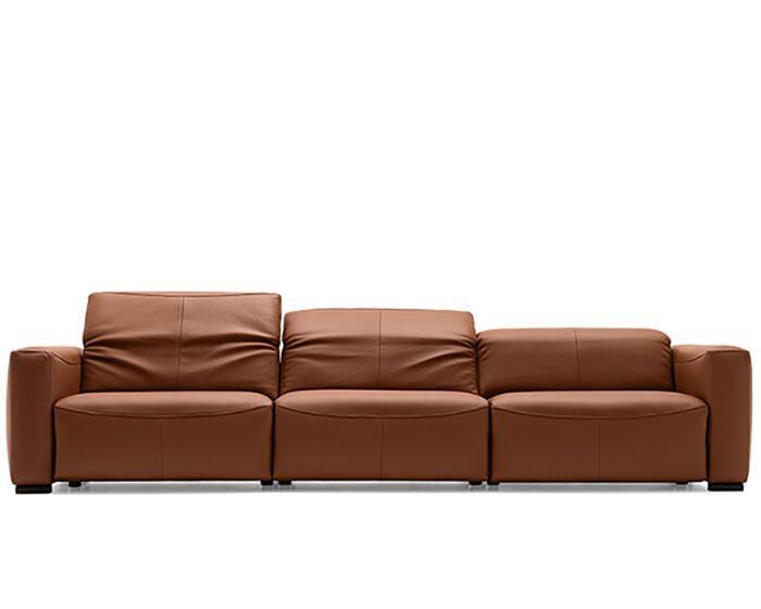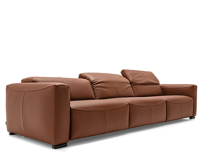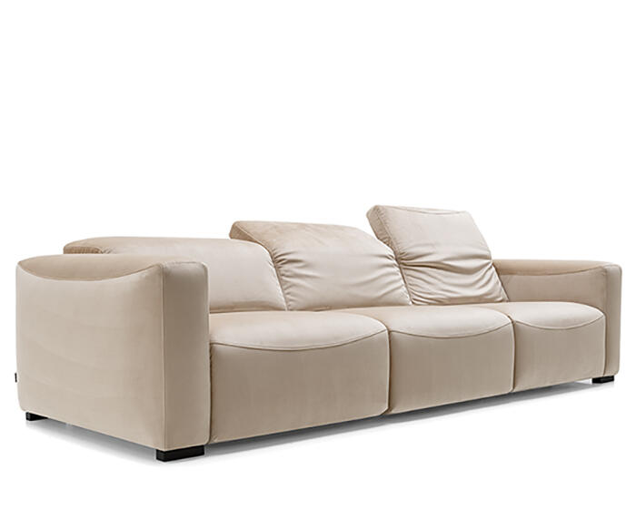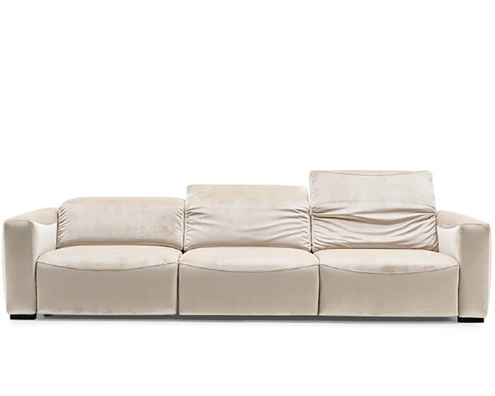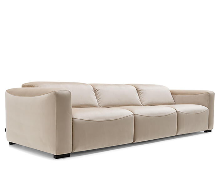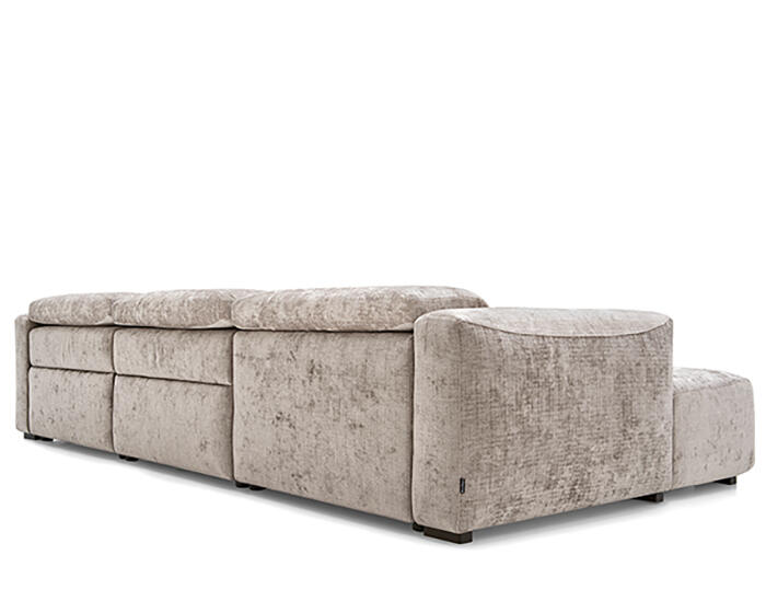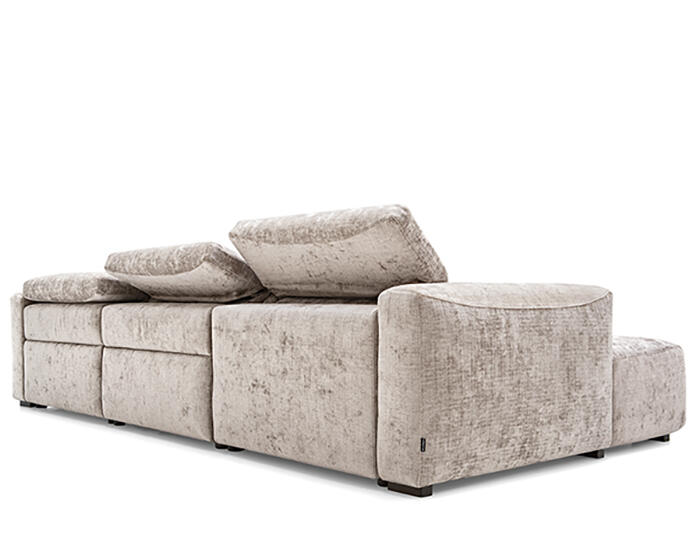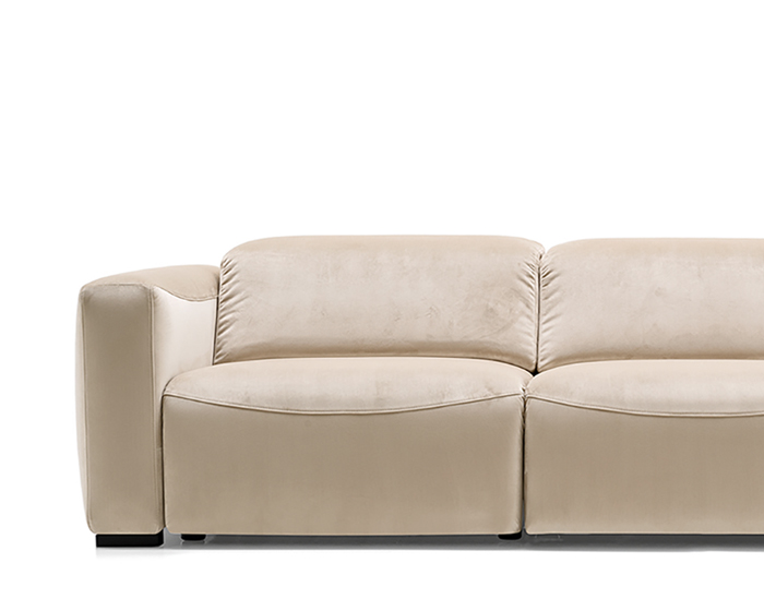 An integrated electric mechanism allows the backrest to recline and the footrest to rise smoothly, adapting the sofa to moments of rest and relaxation. A manually adjustable headrest completes the experience, offering additional support and allowing the posture to shift from upright to fully relaxed with ease.
